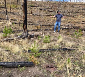 Phil Thornton stands where a cabin once marked the headquarters of the Josephine Lode (The remains of a stove are visible at the bottom of the photo)